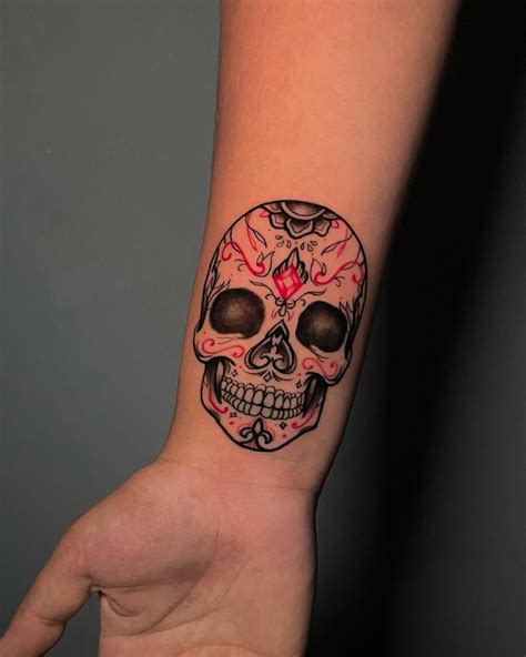 Even scary skulls and menacing demons look stylish with fiery red and orange flames and vibrant blue or glowing grey backgrounds. Brilliant grey evil skulls tattoo on forearm. Colorful inner bicep tattoo designs. This is a great example of a traditional sugar skull. Dead to the law by daniel seong.
