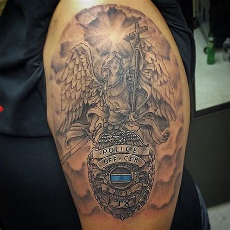 In this, saint michael represents victory, ultimate justice and great bravery. Hopefully i only have one more sitting. Now, he has several tattoos, two of them law enforcement related. By dubuddha april 25, 2018. He is the righteous warrior that took out lucifer and led the army of angels to victory.