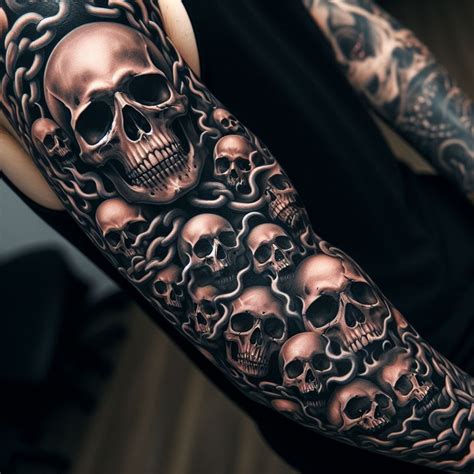 Women can wear skull tattoo as necklace as well. It is a massive tattoo that is drawn from the neck down to the waist. Grey shaded skull with crown tattoo on left full sleeve. These macho icons carry serious energy alongside retro flair. They also can signify mexican heritage by being tied to the day of the dead.