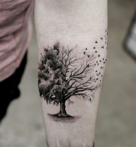 This tattoo is combined with flying of some bulk of words. Birds flying is symbolic of life transferring to another place. Because the birds use the trees to nest and perch, we see a. While the bare branches of a tree may symbolize old age, this tiny bare tree could have a meaning all its own. A sleeve design that.